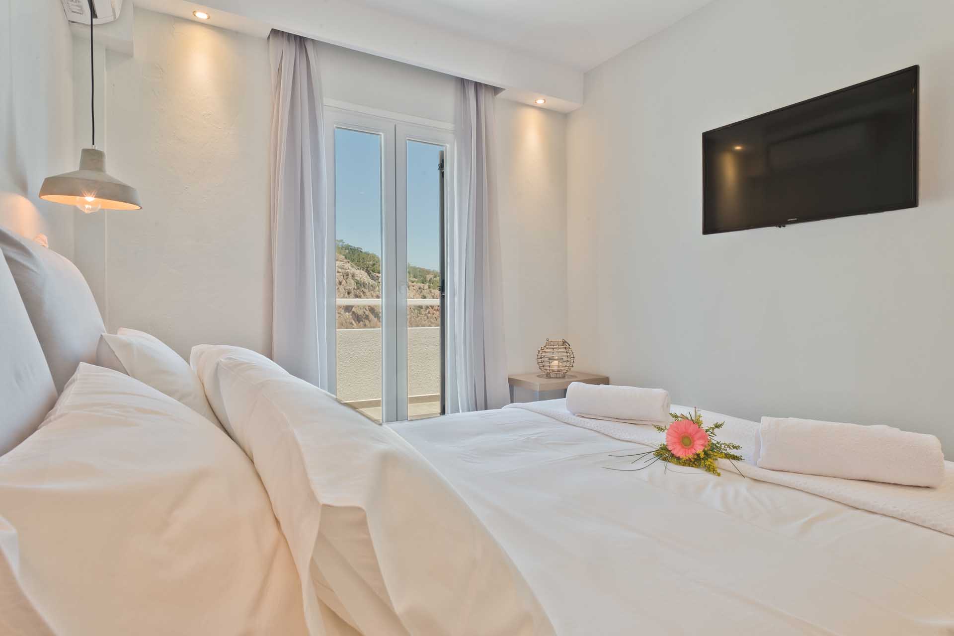 Our luxurious apartments are oriented in a way so you can enjoy the sunrise and are only a few minutes walk from the beach of Kyra Panagia Beach (400m). With amazing panoramic view of the beach and the endless blue of the Aegean Sea as well as the unique, wild and beautiful geomorphology of Kyra Panagia and the opposite(antikri) red mountain!